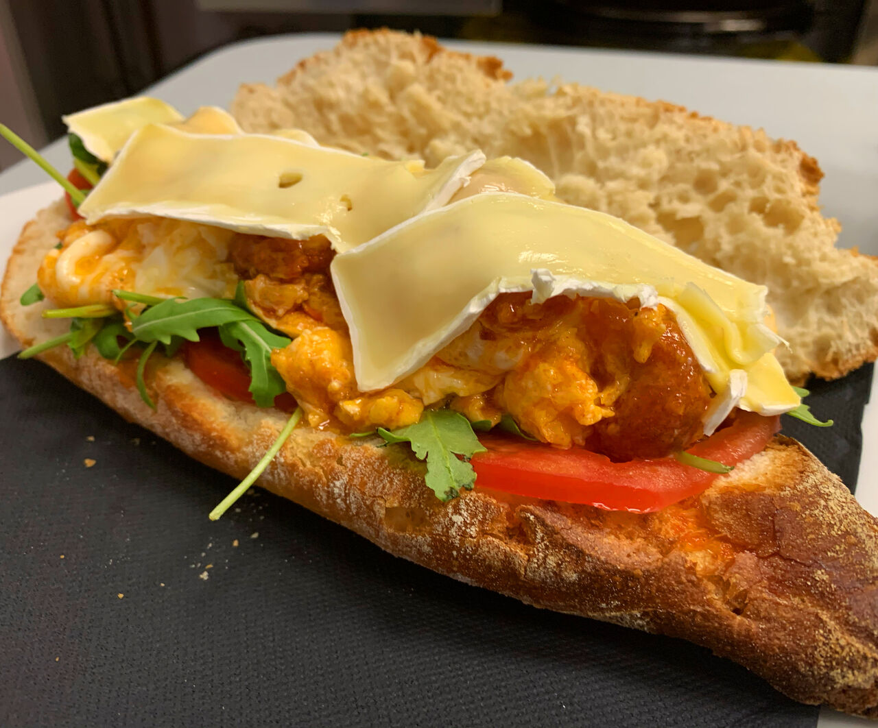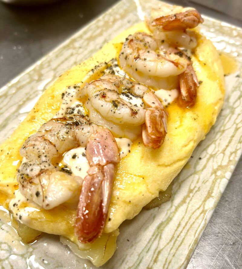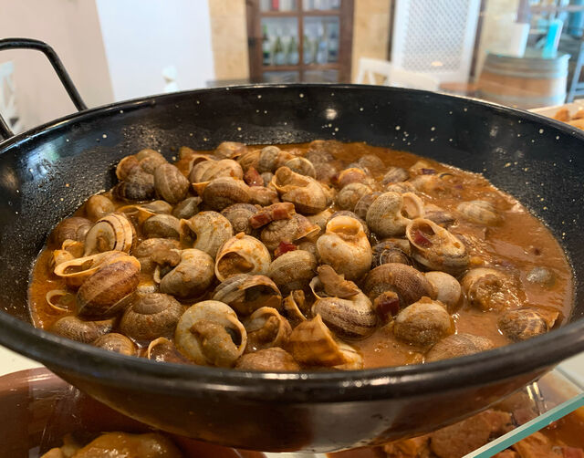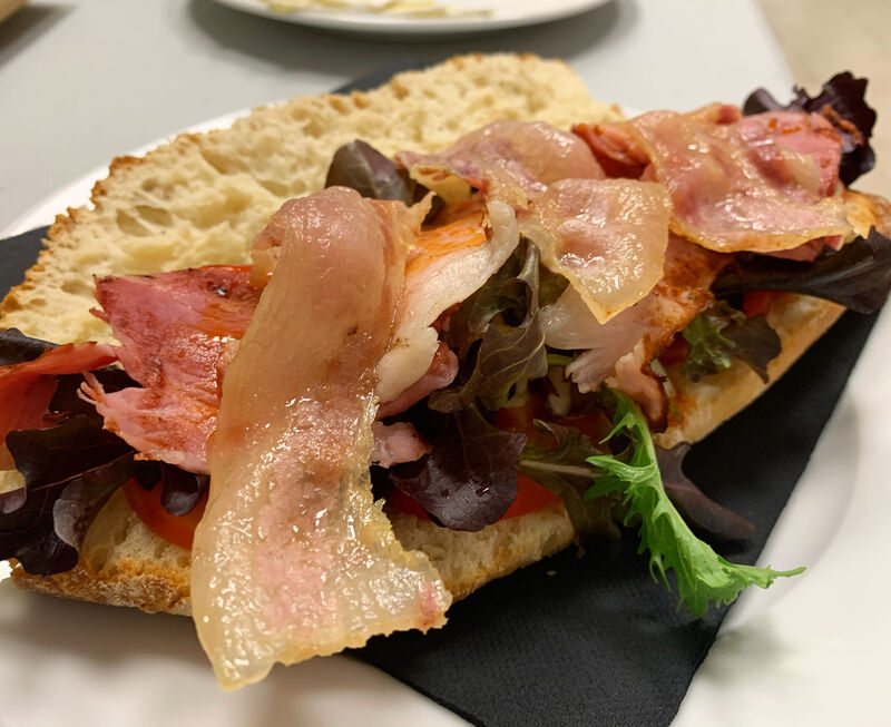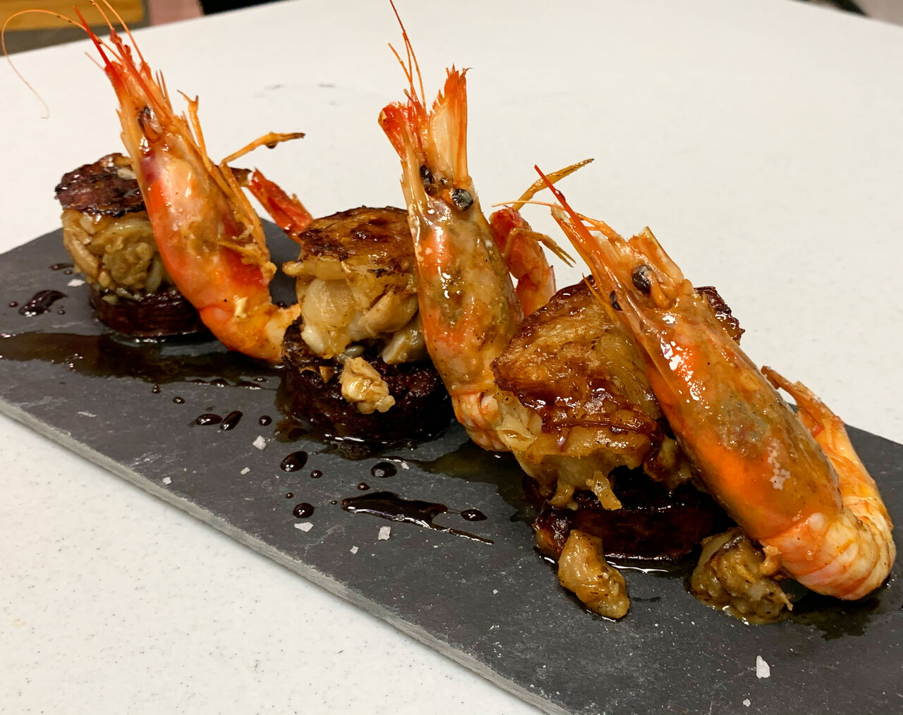 Manitas de cerdo sin trabajo con butifarra negra y gamba roja